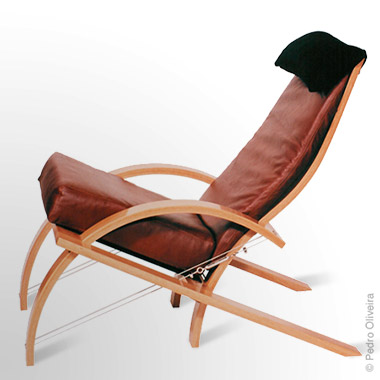 Poltrona Gula, 1998 | Cliente: Particular. | Materiais: Madeira de carvalho; cabo e esticador em aço inox; pele estofada.